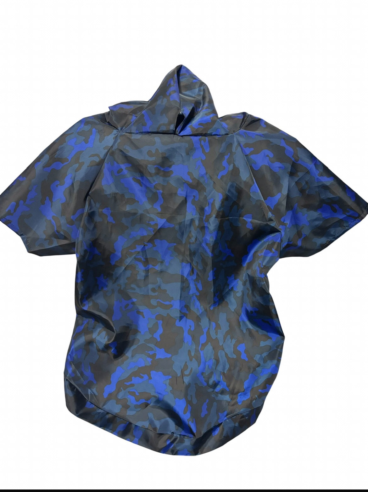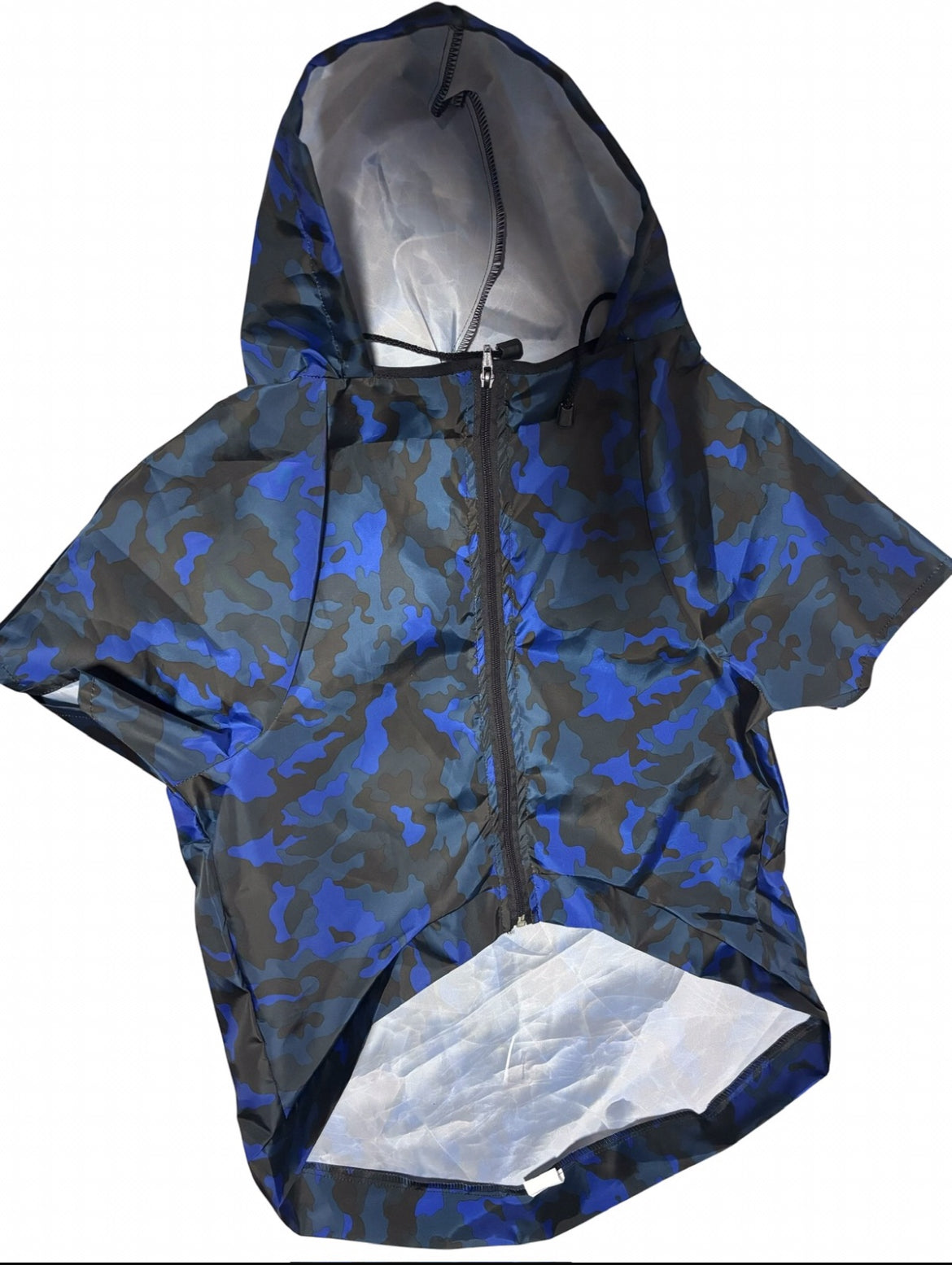 Fabricado con materiales resistentes al agua y costuras reforzadas, este impermeable ofrece una barrera eficaz contra la humedad. Su estampado camuflaje en azul y negro no solo es elegante, sino que también aporta un toque único que hará que tu perro destaque. Además, su diseño ergonómico con capucha ajustada mantiene protegida la cabeza y el cuello sin limitar el movimiento.